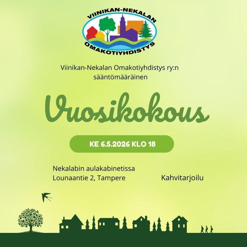 Viinikan-Nekalan Omakotiyhdistys ry:n sääntömääräinen vuosikokous ke 6.5.2026 klo 18.00 alkaen Kokous on tarkoitettu Viinikan-Nekalan Omakotiyhdistys ry:n jäsenille. Esityslista julkaistaan…
