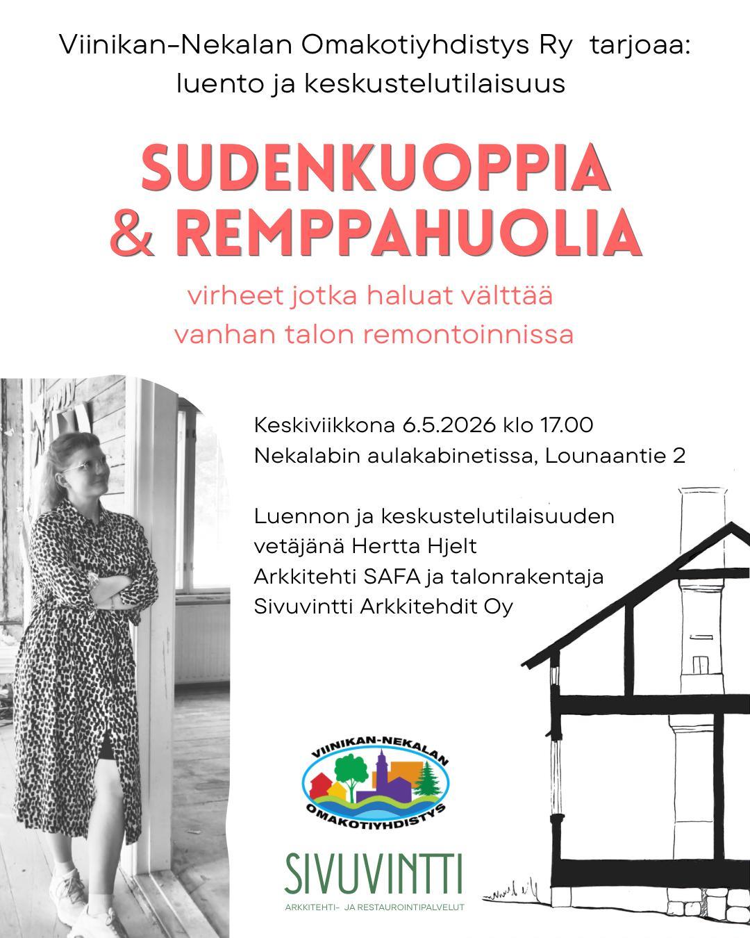 Luennon ja keskustelutilaisuuden vetäjänä arkkitehti SAFA Hertta Hjelt, Sivuvintti Arkkitehdit Oy. Hertta on korjausrakentaminen asiantuntija ja Viinikanpuiston laidalla asuva vanhan talon omistaja.…